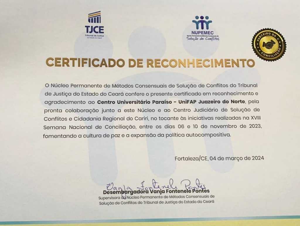Na segunda-feira 04/03, o Tribunal de Justiça do Estado do Ceará, por meio do Núcleo Permanente de Métodos Consensuais de Solução de Conflitos - NUPEMEC, realizou solenidade para entrega de Certificado de Reconhecimento às Instituições de Ensino pela colaboração na XVIII Semana da Conciliação, que foi realizada entre os dias 06 e 10 de novembro de 2023.