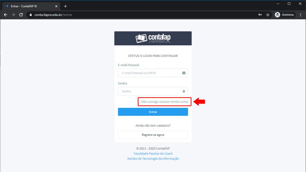 1. Acesse conta.unifapce.edu.br/entrar e clique no link “Não consigo acessar minha conta“: