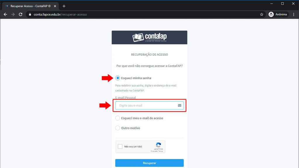 2. Marque “Esqueci minha senha” e, em seguida, no campo “E-mail Pessoal“, informe o e-mail que foi cadastrado e marque a caixa “Não sou um robô“.
