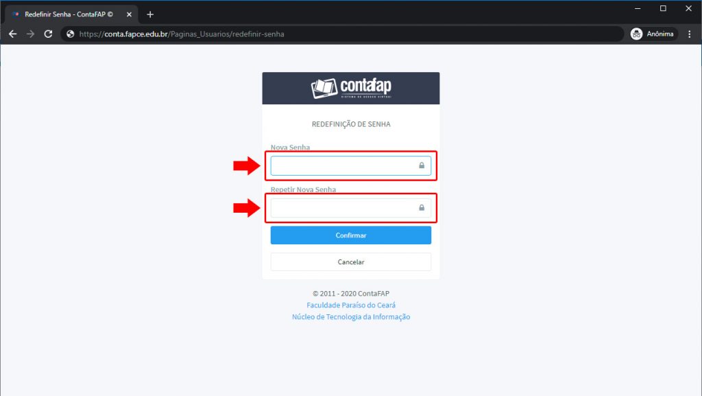 3. Acesse seu e-mail e clique no link para redefinição de sua senha. Quando a janela for aberta, informe sua nova senha, repita a nova senha e clique no botão “Confirmar“.